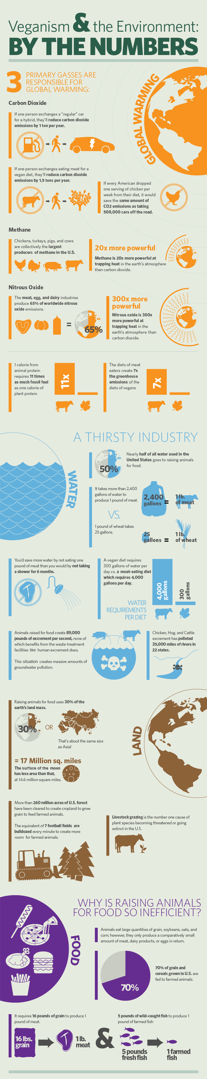 La industria cárnica y ovo-láctea es medioambientalmente insostenible, responsable del 20% de los gases de efecto invernadero, agota y contamina los recursos acuíferos, causa deforestación, desaparición de especies. Una dieta vegana es la manera más efectiva de luchar contra el cambio climático.